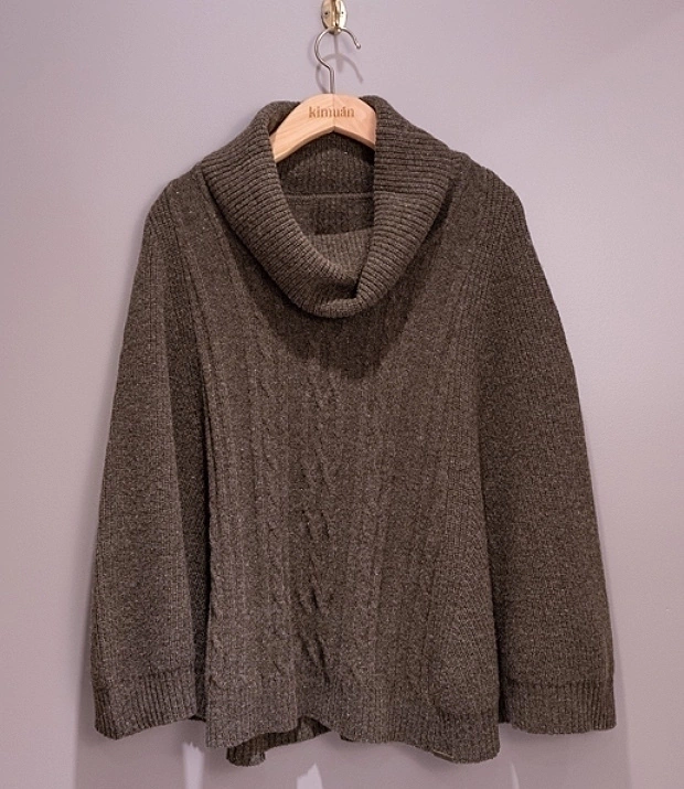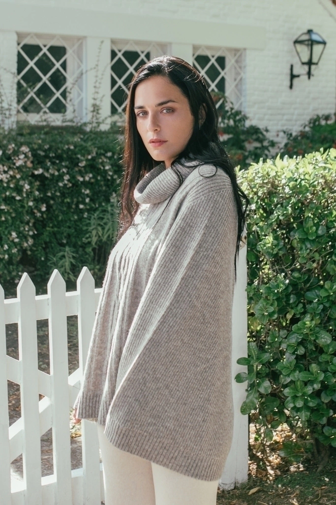 Poncho amplio de corte A con cuello volcado y trabajo de punto que combina aranes, ochos y punto inglés.